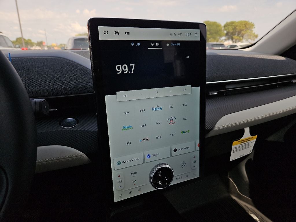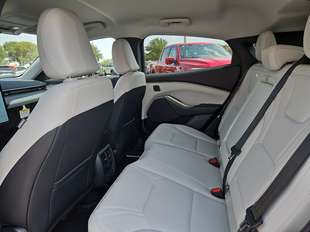 Star White Metallic Tri-Coat 2025 Ford Mustang Mach-E Premium RWD Single-Speed Automatic 4D Sport Utility This vehicle comes with the following features and options : Equipment Group 300A Standard Package, Interior Protection Package (1st & 2nd Row Floor Liners w/o Carpet Mats, Cargo Area Cover, and Cargo Floor Liner), 10 Speakers, 4-Wheel Disc Brakes, ABS brakes, Air Conditioning, Alloy wheels, AM/FM radio: SiriusXM with 360L, Apple CarPlay/Android Auto, Auto High-beam Headlights, Auto-dimming Rear-View mirror, Automatic temperature control, Brake assist, Bumpers: body-color, Compass, Delay-off headlights, Driver door bin, Driver vanity mirror, Dual front impact airbags, Dual front side impact airbags, Electronic Stability Control, Emergency communication system: 911 Assist, Exterior Parking Camera Rear, Four wheel independent suspension, Front anti-roll bar, Front Bucket Seats, Front Center Armrest, Front dual zone A/C, Front License Plate Bracket, Front reading lights, Fully automatic headlights, Garage door transmitter, Heated door mirrors, Heated front seats, Heated steering wheel, Heated/Ventilated Perforated ActiveX Bucket Seats, Illuminated entry, Internet access capable: FordPass Connect, Knee airbag, Low tire pressure warning, Memory seat, Mobile Power Cord (120V/240V), Navigation system: Connected Navigation, Occupant sensing airbag, Outside temperature display, Overhead airbag, Overhead console, Panic alarm, Passenger door bin, Passenger vanity mirror, Power door mirrors, Power driver seat, Power Liftgate, Power passenger seat, Power steering, Power windows, Radio data system, Radio: B&O Sound System by Bang & Olufsen, Rain sensing wipers, Rear anti-roll bar, Rear seat center armrest, Rear side impact airbag, Rear window defroster, Rear window wiper, Remote keyless entry, Security system, SiriusXM w/360L, Speed control, Speed-sensing steering, Speed-Sensitive Wipers, Split folding rear seat, Spoiler, Steering wheel mounted audio controls, SYNC 4A w/Enhanced Voice Recognition, Telescoping steering wheel, Tilt steering wheel, Traction control, Trip computer, Turn signal indicator mirrors, Variably intermittent wipers, Ventilated front seats, and Wheels: 19 Bright Machined-Face Aluminum.