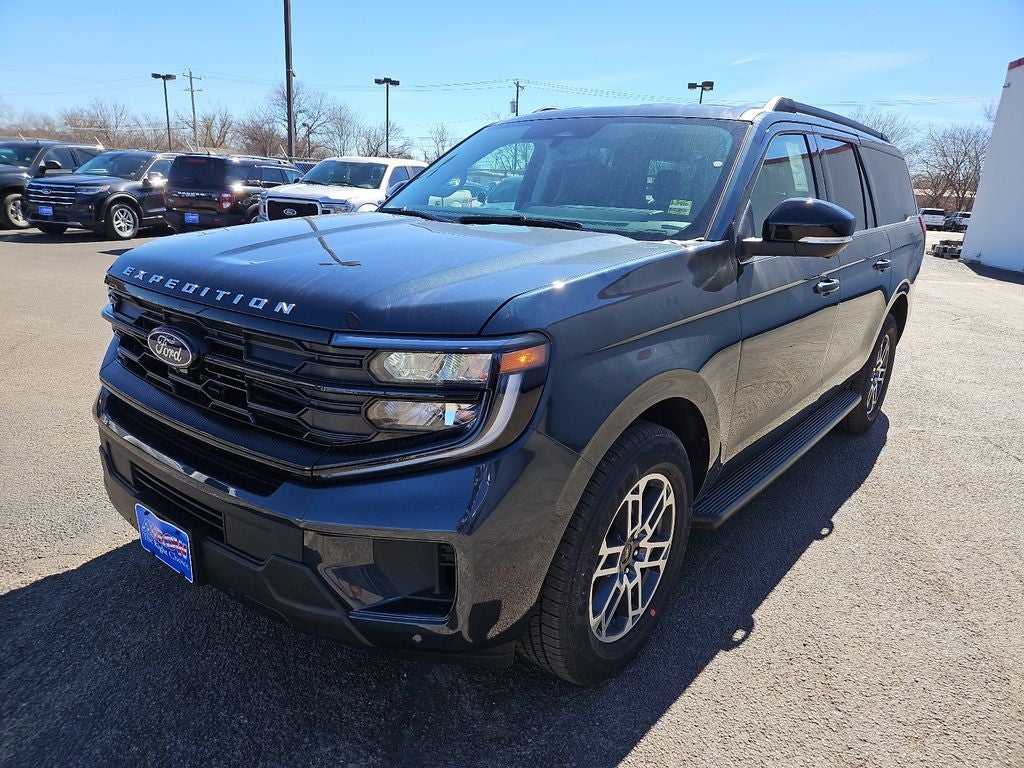 Stone Blue Metallic 2026 Ford Expedition Max Active RWD 10-Speed Automatic 4D Sport Utility This vehicle comes with the following features and options : Equipment Group 202A Touring Package (2nd Row Power-Folding Captain's Chairs, 3.31 Axle Ratio, 360-Degree Zone Lighting, 3rd Row Vinyl Seats, 4-Door Intelligent Access (Lock/Unlock), 4-Way Manual Head Restraints, Active Air Dam, ActiveX-Trimmed Front Heated Captain's Chairs, Dual Power-Folding Sideview Mirrors with Autofold, Flex Powered Console, Ford Digital Experience, Ford Split Gate, Front Side Laminated Glass, Heated Steering Wheel, Memory Driver Seat, Power Tilt/Telescopic Steering Wheel with Memory, Pro Power Onboard - 400W, Radio: AM/FM Stereo with MP3 Capable, Rain Sensitive Windshield Wipers, SiriusXM with 360L, USB Ports, and Wheels: 18 x 8.5 Dark Alloy Painted Aluminum), Ford Connectivity Package (1-Year Included), 3rd Row Flexible Seating (40/20/40), 3rd row seats: split-bench, 4-Wheel Disc Brakes, 6 Speakers, ABS brakes, Air Conditioning, Alloy wheels, AM/FM radio: SiriusXM with 360L, Apple CarPlay/Android Auto, Auto High-beam Headlights, Auto-dimming Rear-View mirror, Automatic temperature control, Brake assist, Bumpers: body-color, Cloth Front Captain's Chairs, Compass, Delay-off headlights, Driver door bin, Driver vanity mirror, Dual front impact airbags, Dual front side impact airbags, Electronic Stability Control, Emergency communication system: 911 Assist, Exterior Parking Camera Rear, Four wheel independent suspension, Front anti-roll bar, Front Bucket Seats, Front Center Armrest, Front dual zone A/C, Front License Plate Bracket, Front reading lights, Fully automatic headlights, Heated door mirrors, Illuminated entry, Intersection Assist, Low tire pressure warning, Navigation System, Occupant sensing airbag, Outside temperature display, Overhead airbag, Overhead console, Panic alarm, Passenger door bin, Passenger vanity mirror, Power door mirrors, Power driver seat, Power passenger seat, Power steering, Power windows, Radio data system, Rear air conditioning, Rear anti-roll bar, Rear reading lights, Rear window defroster, Rear window wiper, Reclining 3rd row seat, Remote keyless entry, Security system, Speed control, Speed-sensing steering, Speed-Sensitive Wipers, Split folding rear seat, Spoiler, Steering wheel mounted audio controls, Tachometer, Telescoping steering wheel, Tilt steering wheel, Traction control, Trip computer, Variably intermittent wipers, Voltmeter, and Wheels: 20 x 8.5 Bright Machined Aluminum.