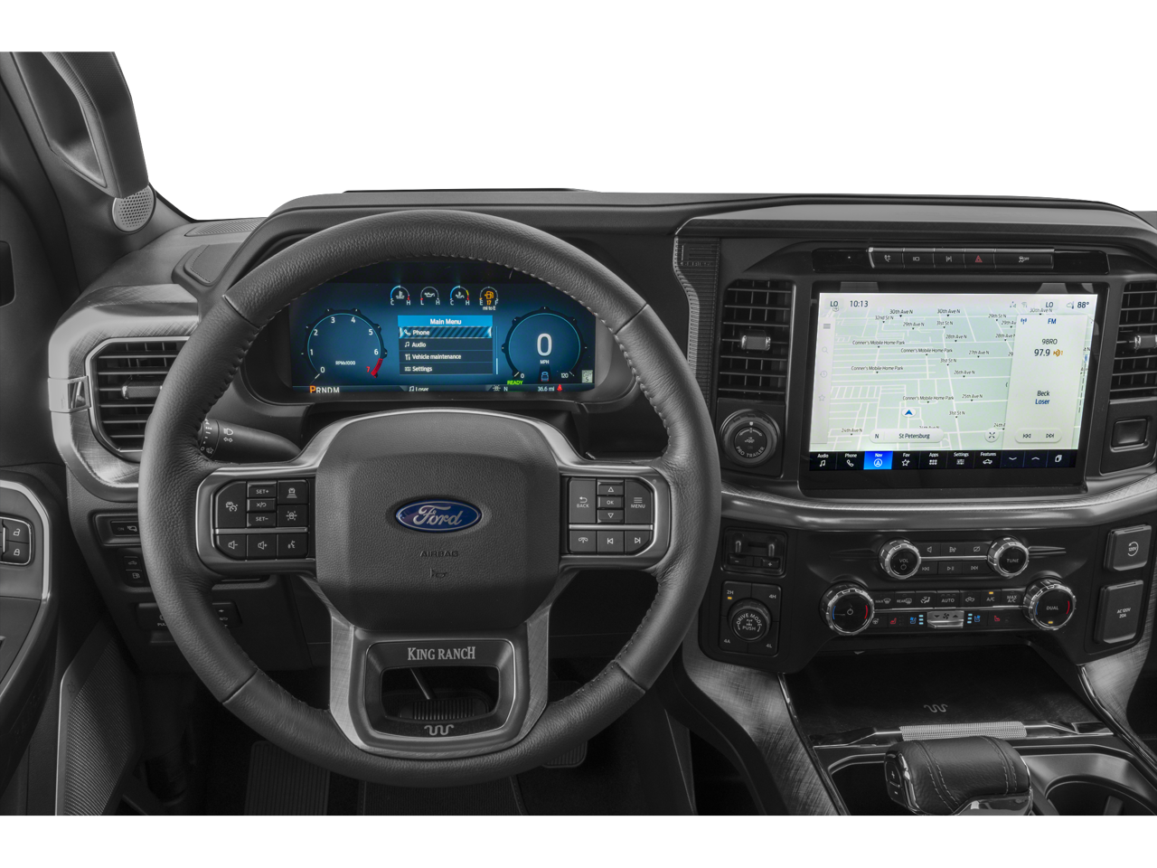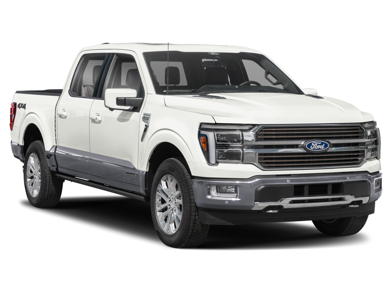 White 2026 Ford F-150 King Ranch 4WD 10-Speed Automatic 4D SuperCrew 4WD. This vehicle comes with the following features and options : Equipment Group 601A High (Electronic Locking with 3.55 Axle Ratio and Wheels: 20 Chrome-Like PVD), Ford Connectivity Package (1-Year Included), FX4 Off-Road Package (4x4 FX4 Off-Road Bodyside Decal, Hill Descent Control, and Off-Road Tuned Front Shock Absorbers), GVWR: 7,400 lbs Payload Package, Internet access capable: 5G Modem - Ford Connectivity Package, 4WD, 4-Wheel Disc Brakes, 8 Speakers, ABS brakes, Adjustable pedals, Air Conditioning, Alloy wheels, AM/FM radio: SiriusXM with 360L, Auto High-beam Headlights, Auto tilt-away steering wheel, Auto-dimming door mirrors, Auto-dimming Rear-View mirror, Automatic temperature control, Brake assist, Chrome wheels, Compass, Delay-off headlights, Driver door bin, Driver vanity mirror, Dual front impact airbags, Dual front side impact airbags, Electronic Stability Control, Emergency communication system: SYNC 4 911 Assist, Front anti-roll bar, Front Bucket Seats, Front Center Armrest, Front dual zone A/C, Front fog lights, Front reading lights, Front wheel independent suspension, Fully automatic headlights, Garage door transmitter, Genuine wood dashboard insert, Heated door mirrors, Heated front seats, Heated rear seats, Heated steering wheel, Illuminated entry, Leather steering wheel, Low tire pressure warning, Memory seat, Navigation system: Connected Navigation, Occupant sensing airbag, Outside temperature display, Overhead airbag, Overhead console, Panic alarm, Passenger door bin, Passenger vanity mirror, Pedal memory, Power door mirrors, Power driver seat, Power passenger seat, Power steering, Power windows, Radio data system, Radio: B&O Sound System by Bang and Olufsen, Rain sensing wipers, Rear reading lights, Rear seat center armrest, Rear step bumper, Rear window defroster, Remote keyless entry, Security system, Speed control, Split folding rear seat, Steering wheel memory, Steering wheel mounted audio controls, SYNC 4 with Enhanced Voice Recognition, Tachometer, Telescoping steering wheel, Tilt steering wheel, Traction control, Trip computer, Turn signal indicator mirrors, Twin Panel Moonroof, Variably intermittent wipers, and Ventilated front seats.