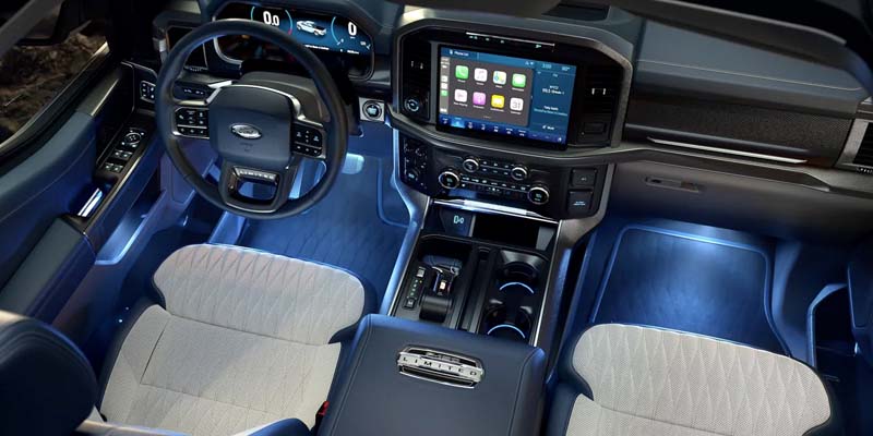 With the Lariat level, the Lightning adds a premium geometric grey-ion satin grille. It also comes with 20-inch dark carbonized gray wheels. The running boards become retractable on the Lariat. For comfort, leather-trimmed heated and ventilated seating is added to the cabin along with the SYNC 4A system with a 15.5inch touchscreen.