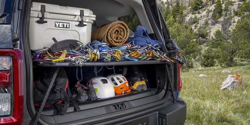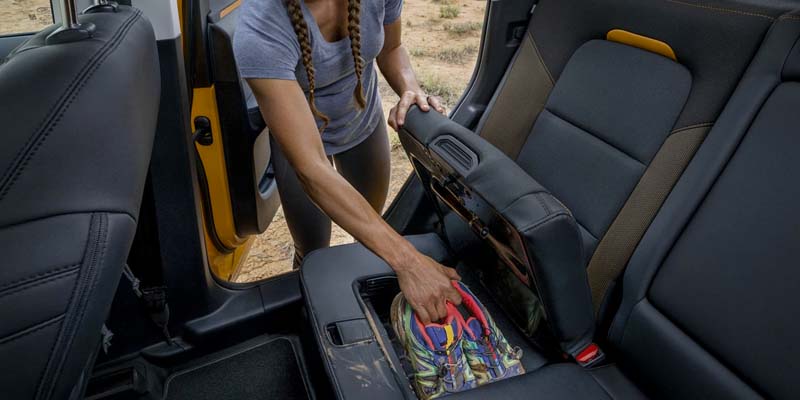 The inside of the 2022 Ford Bronco boasts plenty of space (you might not even miss the full-size Bronco here) and a ton of luxury for a vehicle that prides itself on its ability to handle off-road conditions like a pro. The roofline rises in the rear, giving passengers plenty of headroom, and the legroom available in the back is just as ample. Even though this is the sport, there's room in the cargo space to fit two mountain bikes, which is actually pretty substantial! The storage bins located underneath the back seats make this a super kid-friendly ride.